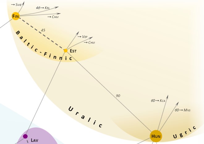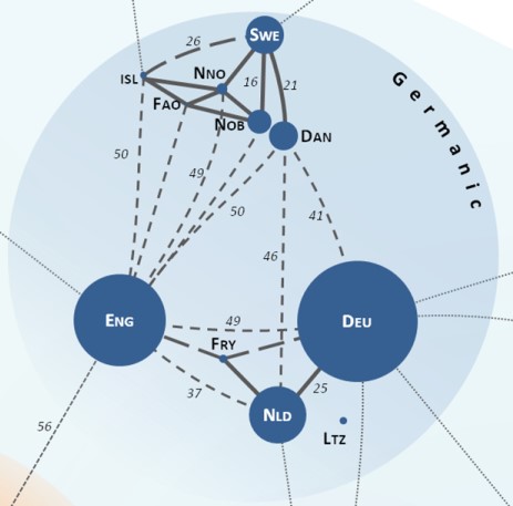 Leksiskais attālums ir vismazākais katrā valodu saimē, un atsevišķās valodas ir sakārtotas tā, lai atspoguļotu to relatīvo attālumu viena no otras.