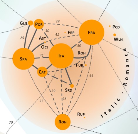 Itāļu valoda ir rosīgais itāļu-romāņu valodu saimes centrs, kas ir tikpat tuva portugāļu valodai, cik franču valodai. Rumāņu valoda ir izņēmums gan leksiskā, gan ģeogrāfiskā ziņā. Katalāņu valoda ir trūkstošais posms starp itāļu un spāņu valodu. Kartē ir attēlotas arī vairākas mazāk zināmas romāņu valodas: galisiešu, sardīniešu, valoņu, oksitāņu, friūliešu, pikāru, franku-provansiešu, aromaniešu, astūriešu un retoromaņu valodas. Latīņu valoda, kas ir minēta leģendā, bet nav atrodama kartē, lai gan vairs nav dzīva valoda, ir svarīgs atskaites punkts, jo tā ir visu romāņu valodu priekštece.
