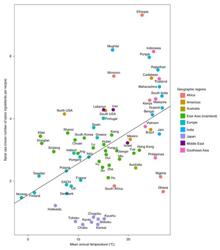 Lai kāds būtu iemesls, tika secināts ka pastāv vistiešākā korelācija ar to, ka jo karstāks ir klimats, jo asāks jeb pikantāks ir ēdiens. Izpētes rezultātā tika izveidots grafiks, kur uz X ass parādās valstu gada vidējā temperatūra (°C) , bet uz Y ass ir redzams vidējais garšvielu sastāvdaļu skaits uz recepti.